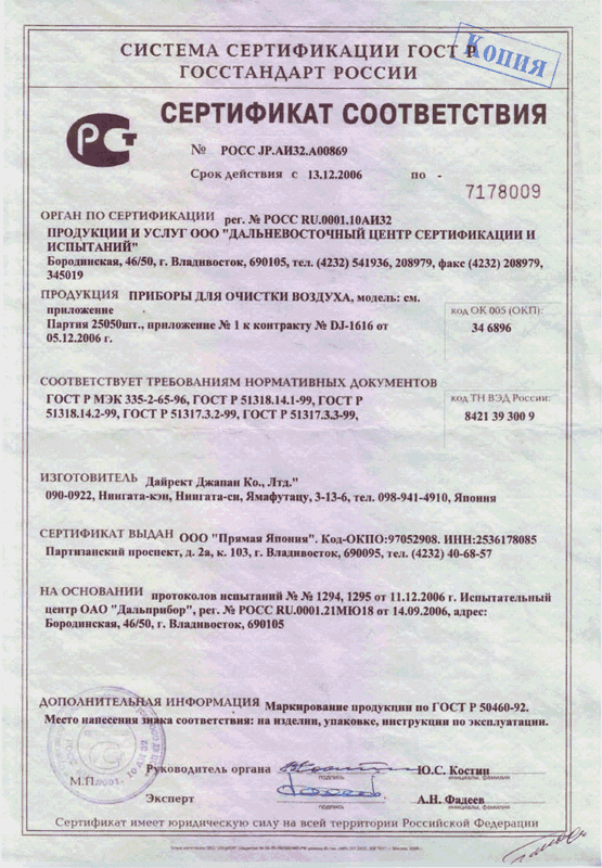 Сертификат соответствия госстандарта на воздухоочистители Direct Japan