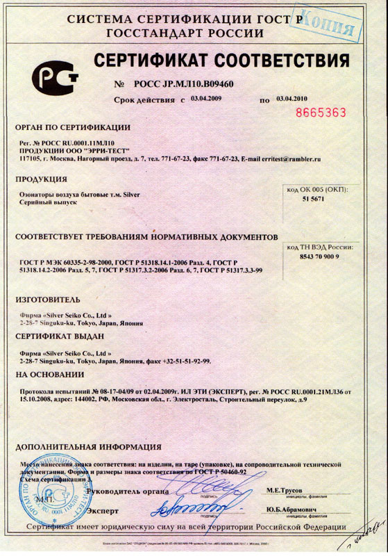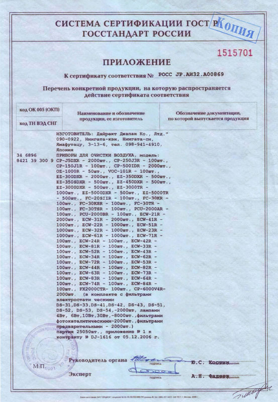 Сертификат соответствия госстандарта на воздухоочистители Direct Japan, приложение