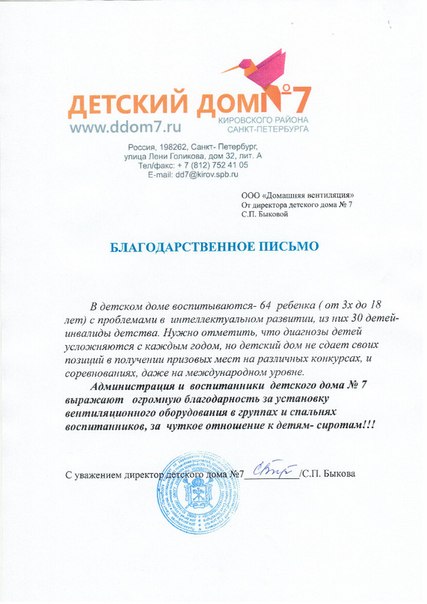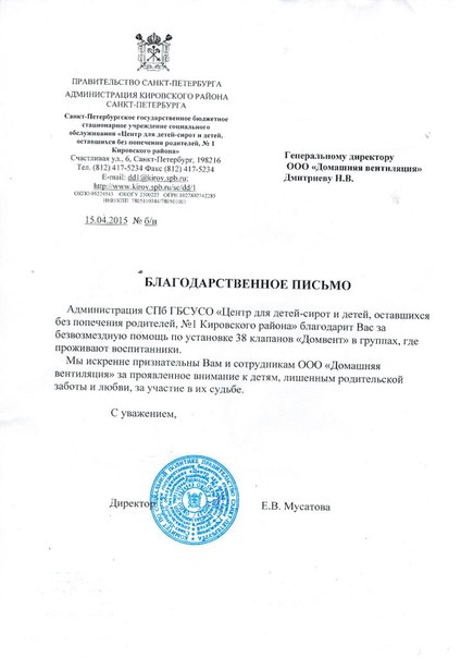 2) Благодарственное письмо от администрации СПб ГБСУСО «Центр для детей-сирот и детей, оставшихся без попечения родителей, №1 Кировского района».