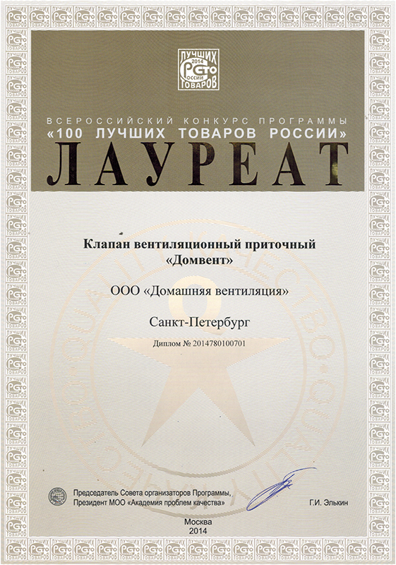 В прошлом году наш вентиляционный клапан «Домвент» удостоился награды «100 лучших товаров России».
