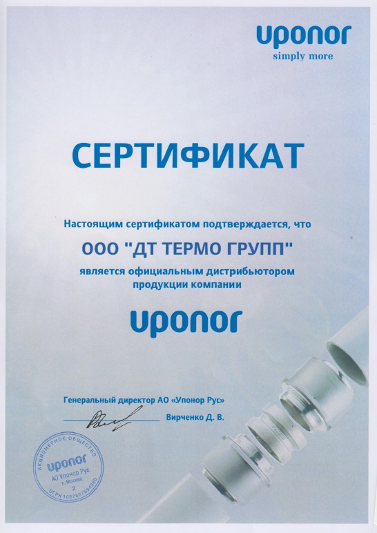 Сертификат официального дистрибьютора компании Uponor