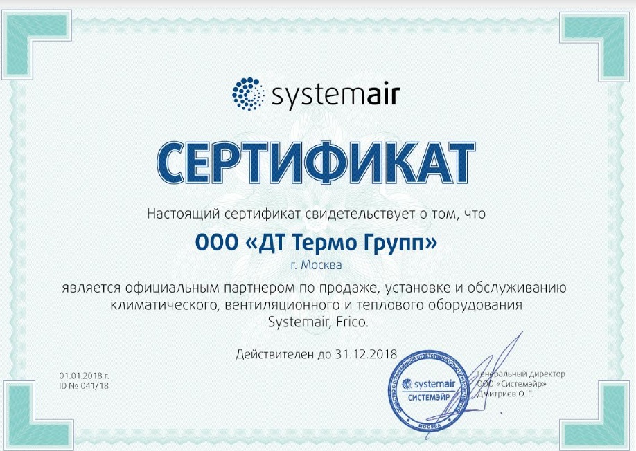 Сертификат официального партнера Systemair
