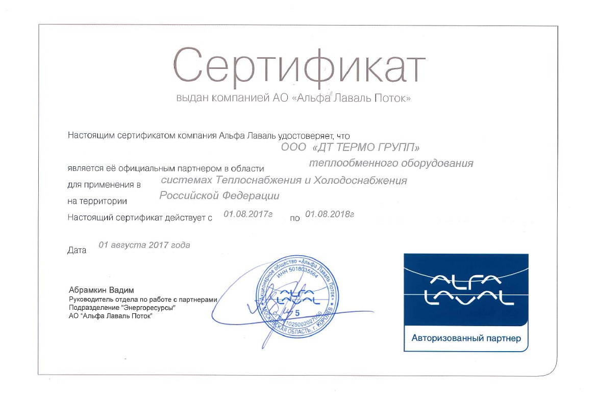 Сертификат официального партнера АО «Альфа Лаваль Поток»