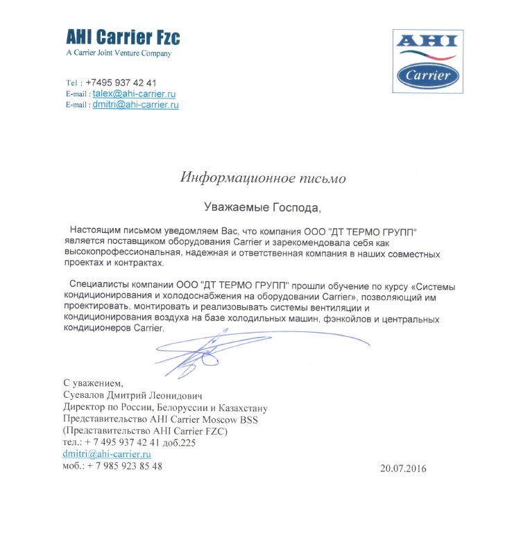 Информационное письмо поставщика оборудования Carrier