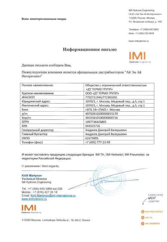 Информационное письмо официального дистрибьютора IMI