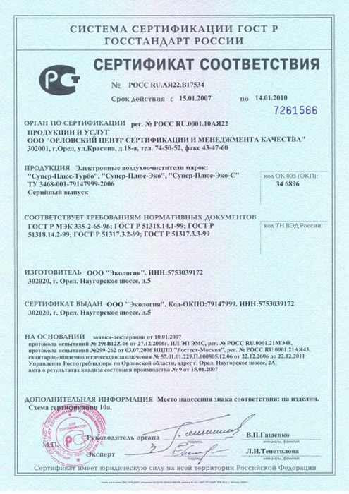 Сертификат соответствия госстандарта России на очистители Супер-Плюс