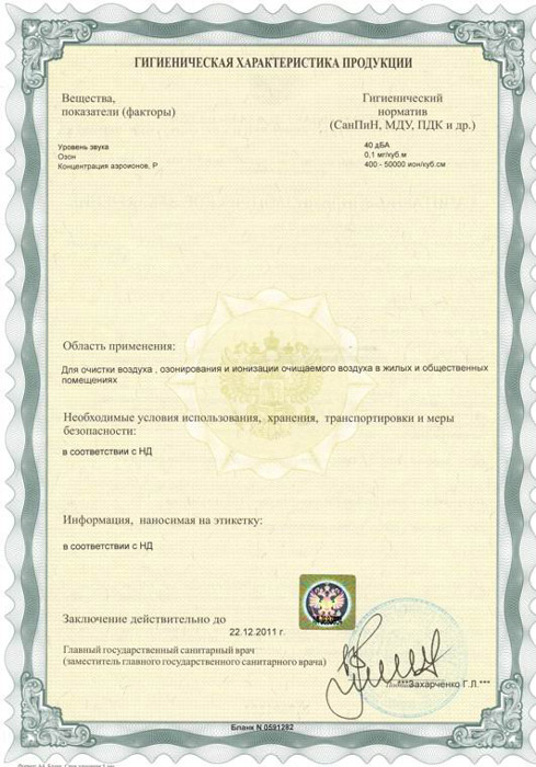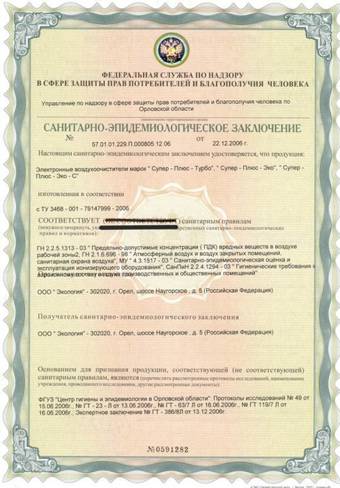 Санитарно-эпидемиологическое заключение на воздухоочистители Супер-Плюс