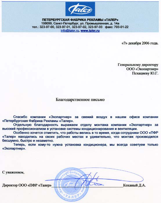 Спасибо компании «Экопартнер» за свежий воздух в нашем офисе компании «Петербургская Фабрика Рекламы «Талер».