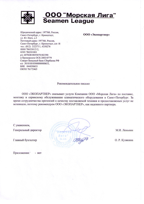ООО «ЭКОПАРТНЕР» оказывает услуги Компании ООО «Морская Лига» по поставке монтажу и сервисному обслуживанию климатического оборудования в Санкт-Петербурге. За время сотрудничества претензий к качеству поставляемой техники и предоставляемых услуг не возникало, поэтому рекомендуем ООО «ЭКОПАРТНЕР», как надежного партнера.