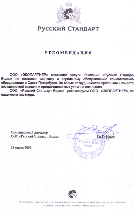 ООО «ЭКОПАРТНЕР» оказывает услуги Компании «Русский Стандарт Водка» по поставке монтажу и сервисному обслуживанию климатического оборудования в Санкт-Петербурге. За время сотрудничества претензий к качеству поставляемой техники и предоставляемых услуг не возникало.