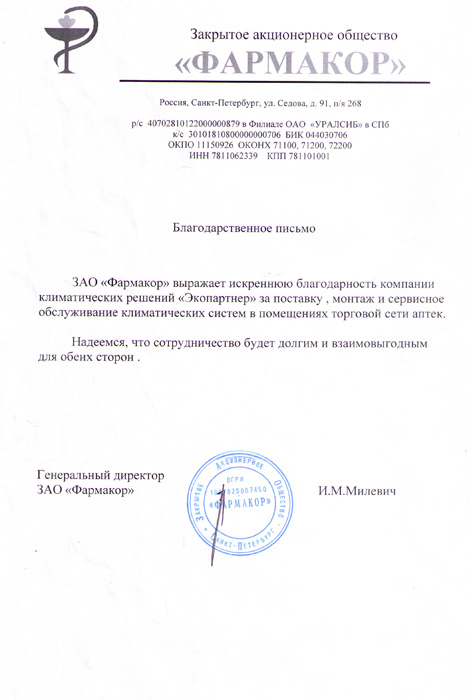 ЗАО “Фармакор» выражает искреннюю благодарность компании климатических решений «Экопартнер» за поставку, монтаж и сервисное обслуживание климатических систем в помещениях торговой сети аптек.