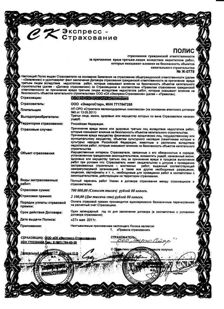 Полис страхования гражданской ответственности за причинение вреда третьим лицам вследствии недостатков работ, которые оказывают влияние на безопасность объектов капитального строительства №Ж-0778
