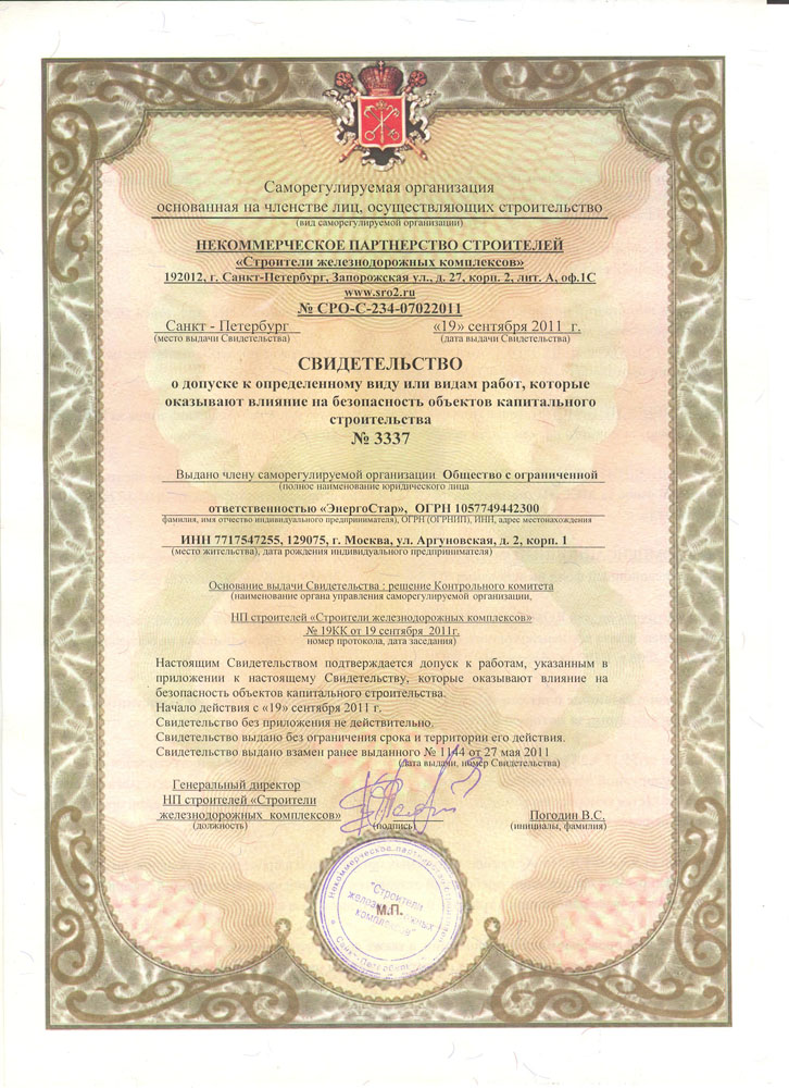 Свидетельство о допуске к определенному виду или видам работ, которые оказывают влияние на безопасность объектов капитального строительства № 3337
