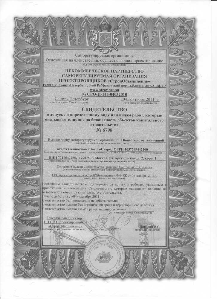 Свидетельство о допуске к определенному виду или видам работ, которые оказывают влияние на безопасность объектов капитального строительства № 6798