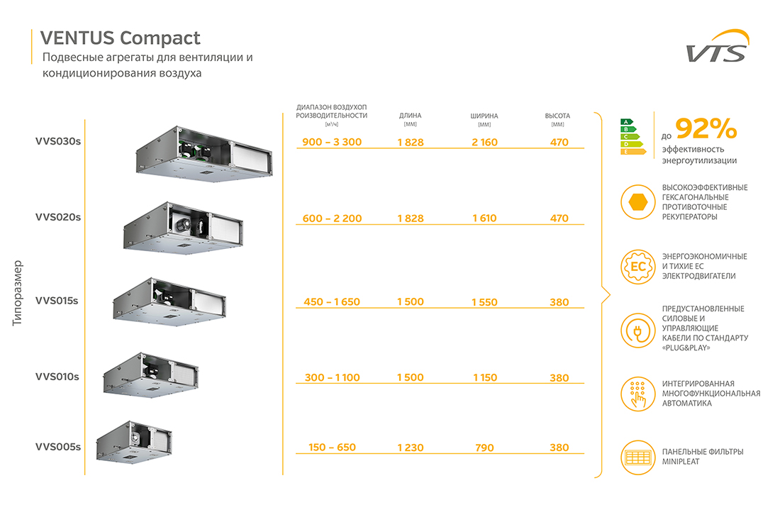 Доступны все типоразмеры подвесных вентиляционных установок VENTUS CompactПодвесные вентиляционные установки VENTUS Compact предлагает VTS Group.
