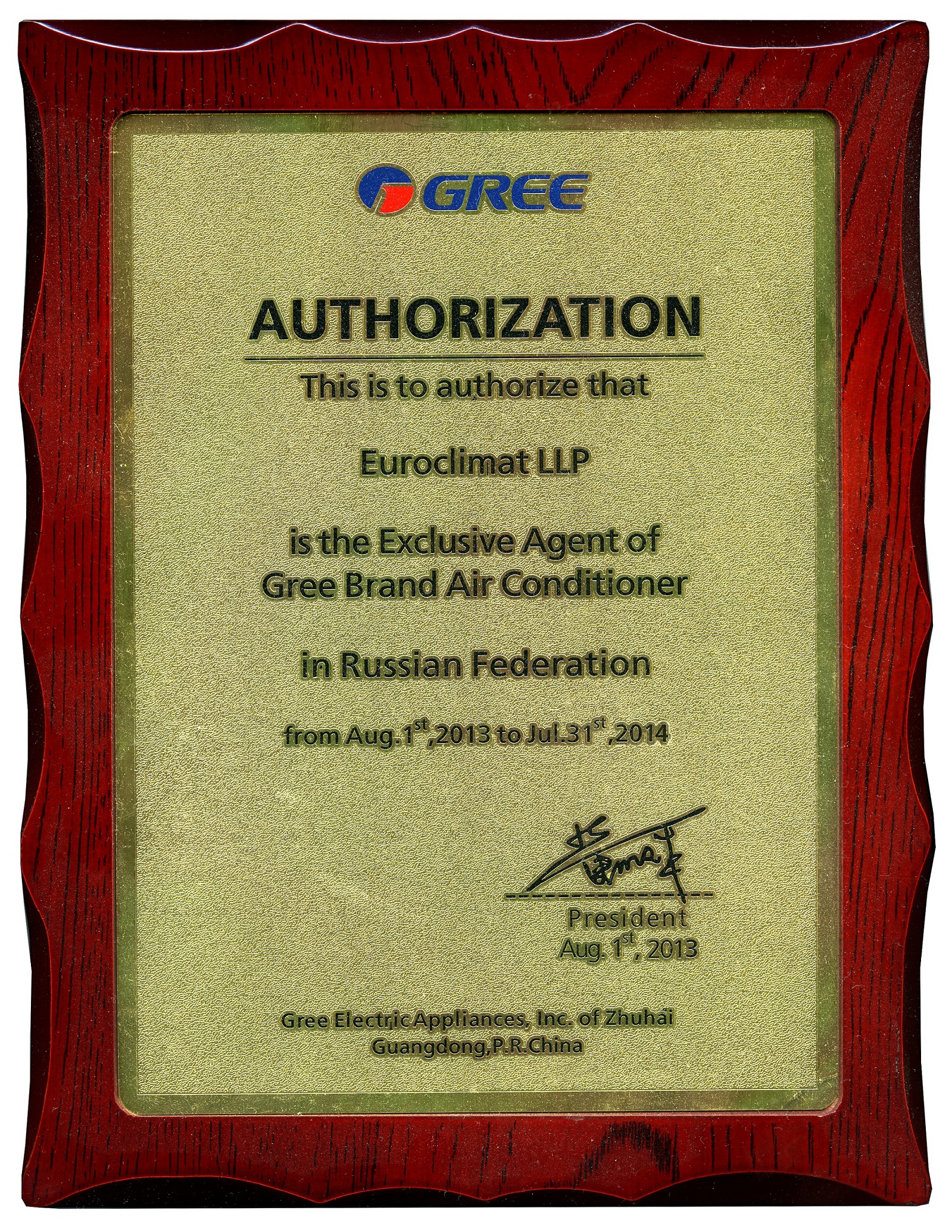 Сертификат эксклюзивного дистрибьютора оборудования GREE в России и странах СНГ