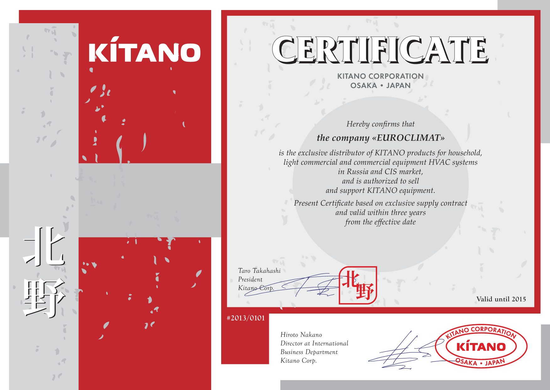 Сертификат эксклюзивного дистрибьютора оборудования KITANO в России и странах СНГ