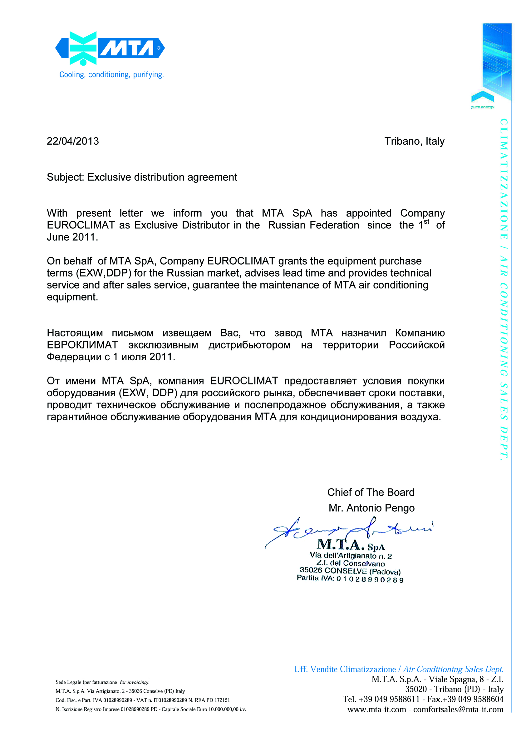 Сертификат эксклюзивного дистрибьютора оборудования MTA в Российской Федерации
