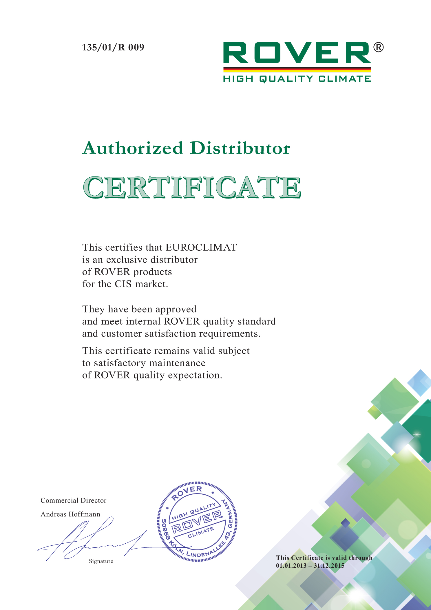 Сертификат эксклюзивного дистрибьютора оборудования ROVER в Российской Федерации