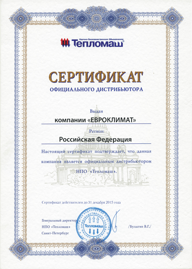 Сертификат официального дистрибьютора оборудования НПО "Тепломаш"