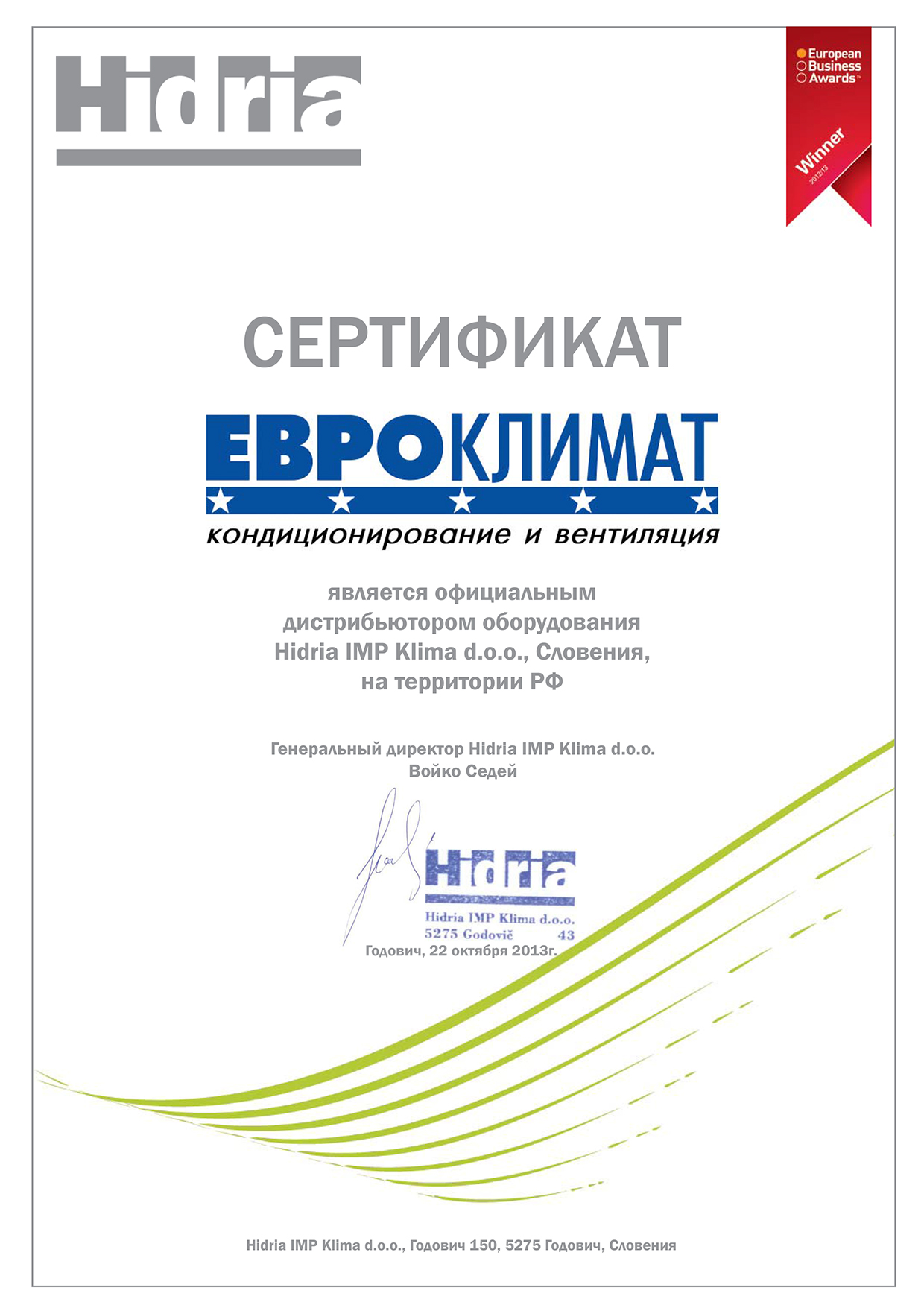 Сертификат официального дистрибьютора оборудования Hidria IMP Klima d.o.o., Словения, на территории РФ