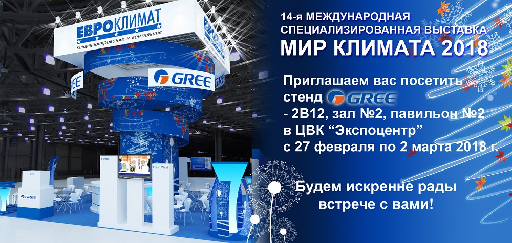 Ждем вас с 27 февраля по 2 марта 2018 года в ЭКСПОЦЕНТРЕ на стенде GREE — 2B12, павильон №2, зал №2, выставка «Мир Климата – 2018».