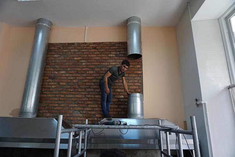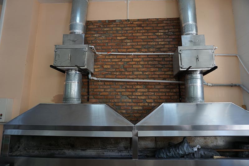 В начале июля нашу компанию обратились представители ресторана «ПАССАЖ» из г. Баку с просьбой.Для обеспечения норм и требований пожарной безопасности, подобрать и установить оптимальную систему очистки и фильтрации вытяжного воздуха, который необходимо удалять от двух мангалов, расположенных в помещении горячего цеха. Длина каждого мангала составляет 2500 мми глубина 600 мм. Над каждым мангалом уже был установлен вытяжной зонт из нержавеющей стали без жироулавливающих фильтров, к которому вертикально подведен оцинкованный воздуховод Ф355 мм. По требованию заказчика система очистки воздуха должна быть максимально компактна и умещаться в промежутке между вытяжным зонтом и кровлей. Так как ресторан расположен в историческом здании и нет никакой возможности вывести новые воздуховоды сквозь кровлю, необходимо использовать только существующие воздуховоды.