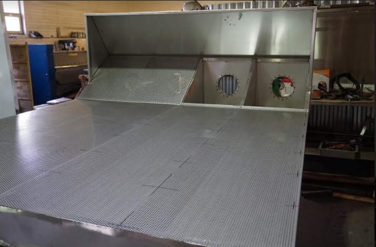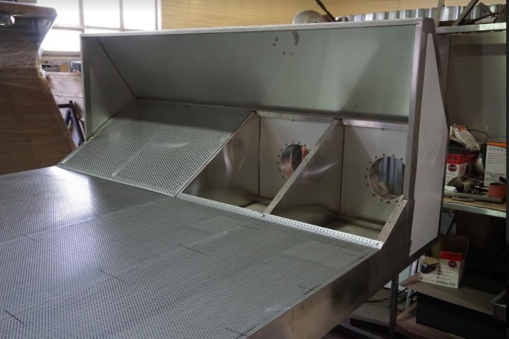 Благодаря совместной работе инженеров и конструкторов, была спроектирована специальная конструкция, представляющая собой раму высотой 2500 мм и длинной 2000 мм разделенную на четыре секции, изготовленную из трубы AISI 304 30х30х1,5 мм с установленным на нее пристенным вытяжным зонтом ТИП 2 400х900х2000 мм изготовленным из нержавеющей стали AISI 304х1,0 мм с 4 врезками Ф200 мм. Задняя стенка и боковые стенки данной конструкции обшиты листами нержавеющей стали AISI 304х1,0 мм, а так же четыре внутренние перемычки, что бы обеспечить равномерную вытяжку из каждой секции. Вся передняя часть данной конструкции, а так же наклонная часть, переходящая в вытяжной зонт, была обшита перфорированными листами, с разным шагом и диаметром перфорации. Протестировав опытный образец, заказчик остался доволен полученным эффектом удаления пыли от рабочей зоны смешивания и оплатил весь заказ, на четыре аналогичные конструкции.