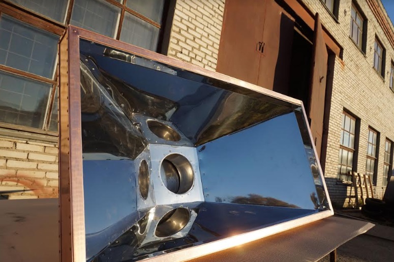 В процессе работы мы добились довольно презентабельного внешнего вида зонта, но внутри от заклепок, что называется, рябило в глазах. Для того, чтобы исправить ситуацию нашим специалистам пришлось изготовить из зеркальной нержавеющей стали AISI 430 х 0,5 мм внутренний, идентичный по форме, защитный кожух. Благодаря декоративному кожуху вытяжной зонт выглядит эстетично не только с внешней, но и с внутренней стороны.