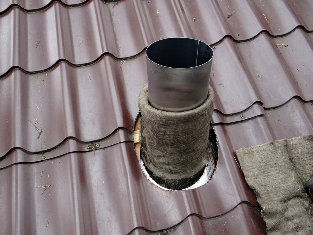 Для удобства прохождения дымохода через односкатную кровлю и во избежание возможного ее возгорания, специалистами компании «ЕвроВентГруп» был изготовлен двухконтурный узел прохода через кровлю Ф200/Ф260 мм, который состоит из двух частей, внутренней и внешней. Для обеспечения пожарной безопасности в нем был использован изоляционный термостойкий базальтовый утеплитель.