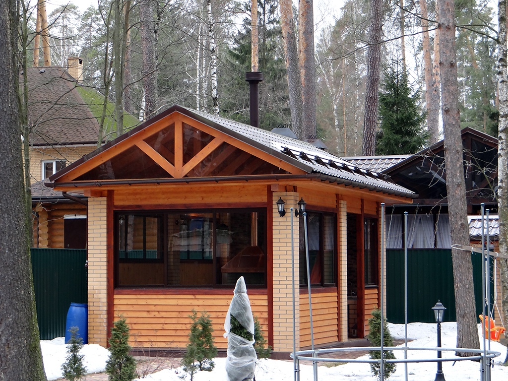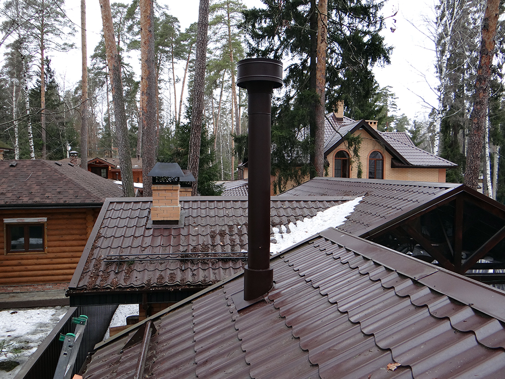 Внешняя часть узла прохода, дымоход и дефлектор были изготовлены, по желанию заказчика, из черной стали толщиной 1,2 мм и покрыты коричневой термостойкой эмалью, которая идеально сочетается с металлочерепицей коричневого цвета, которой покрыта данная беседка.