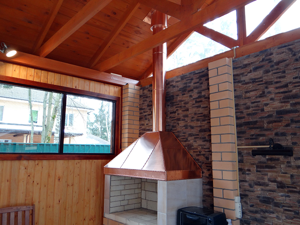 Для придания вытяжному зонту и дымоходам дополнительной эстетики и неповторимого лоска, все изделия были обшиты медными листами и зафиксированы с помощью вытяжных медных заклепок.