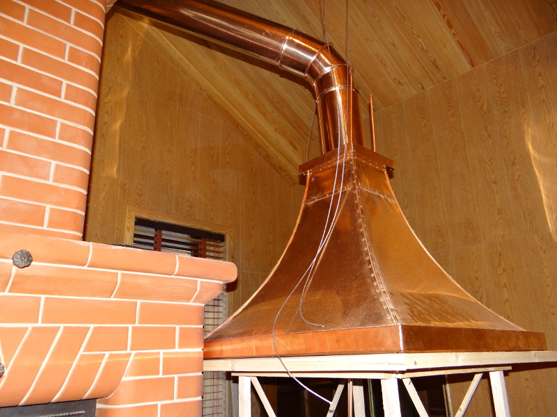 Изготовление мангальных зонтов сложной формы из нержавеющей стали с отделкой медью (каркас - нержавеющая сталь AISI 430х1,0, обшивка - медь М1 толщиной 0,6 мм). Размер зонтов: нижнее сечение 850х850 мм, верхнее сечение 200х200 мм, высота 600 мм, врезка 160 мм.
