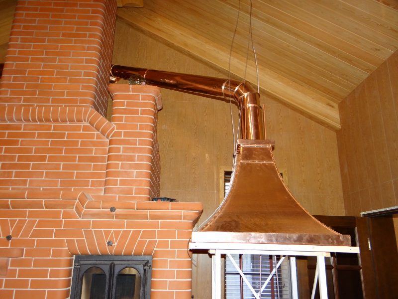 Монтаж системы местной вентиляции. Высота подвеса 1900 мм (от пола до нижней кромки зонта). Зонт подвешивался на стальных тросиках, которые были пропущены через медную трубку.