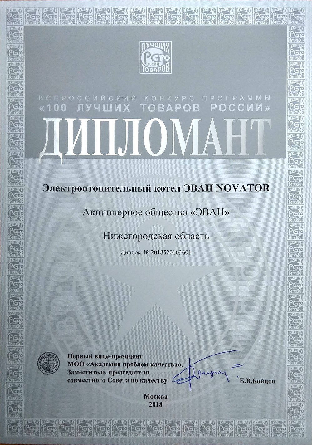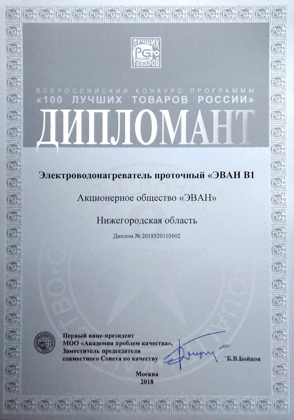 С мая по декабрь компания «ЭВАН» принимала участие во Всероссийской конкурсной Программе «100 лучших товаров России» – вначале в региональном, и затем в федеральном этапе. В конкурсе были представлены два продукта, выпускаемые заводом – электроотопительный котел ЭВАН NOVATOR и проточный водонагреватель ЭВАН В1.