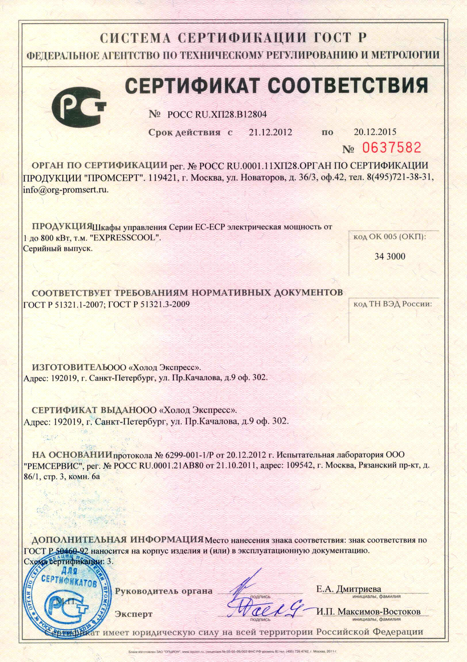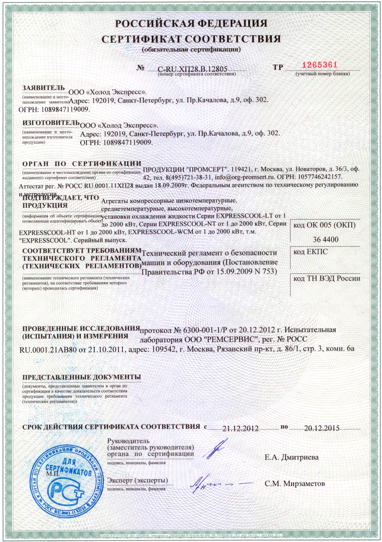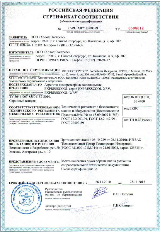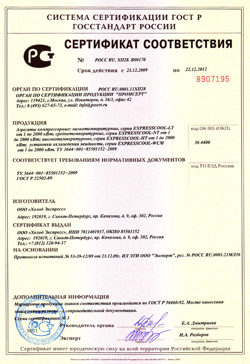 Сертификат соответствия на агрегаты компрессорные холодильные Express Cool