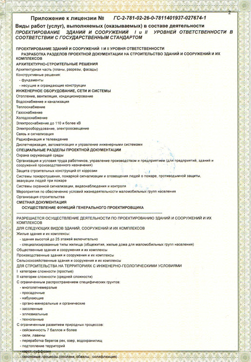 Лицензия на осуществление проектирования зданий и сооружений I и II уровней ответственности в соответствии с государственным стандартом (стр.2)