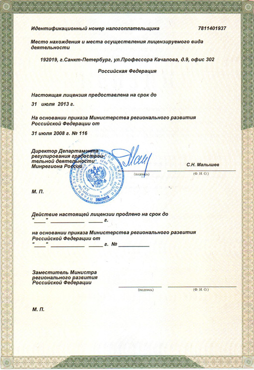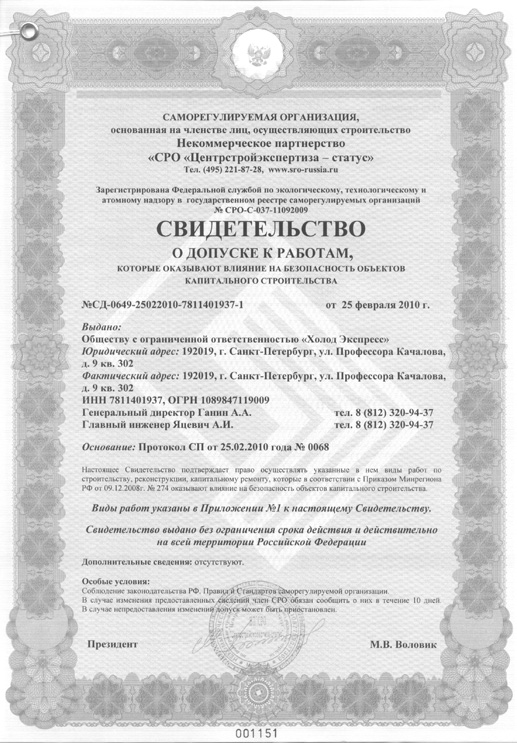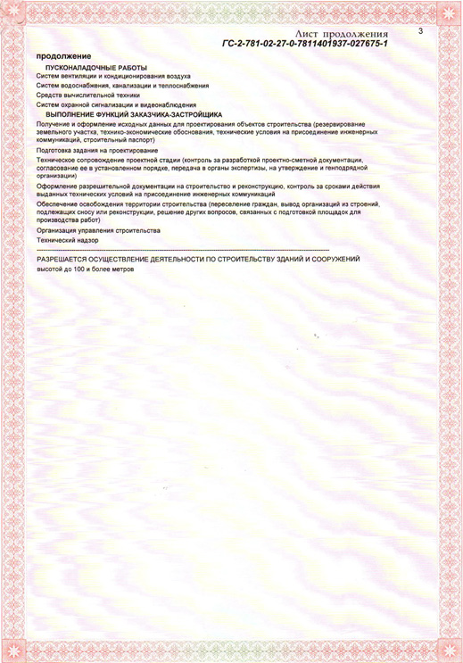 Свидетельство о допуске к определенному виду или видам работ, которые оказывают влияние на безопасность объектов капитального строительства № СД-0649-25022010-7811401937-3