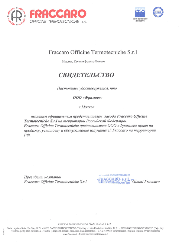 Свидетельство официального представительства завода Fraccaro Officine Termotecniche S.r.l на территории Российской Федерации