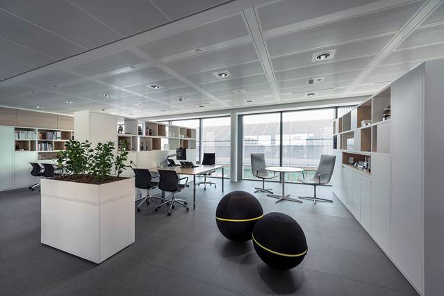 В необычное дизайнерское решение комплекса, состоящее из трех заводских корпусов, офисных помещений, перемежаемых оранжереями, остекленными на всю высоту были интегрированы подвесные потолки PLAFORAD, площадью покрытия 6 000 кв.м.