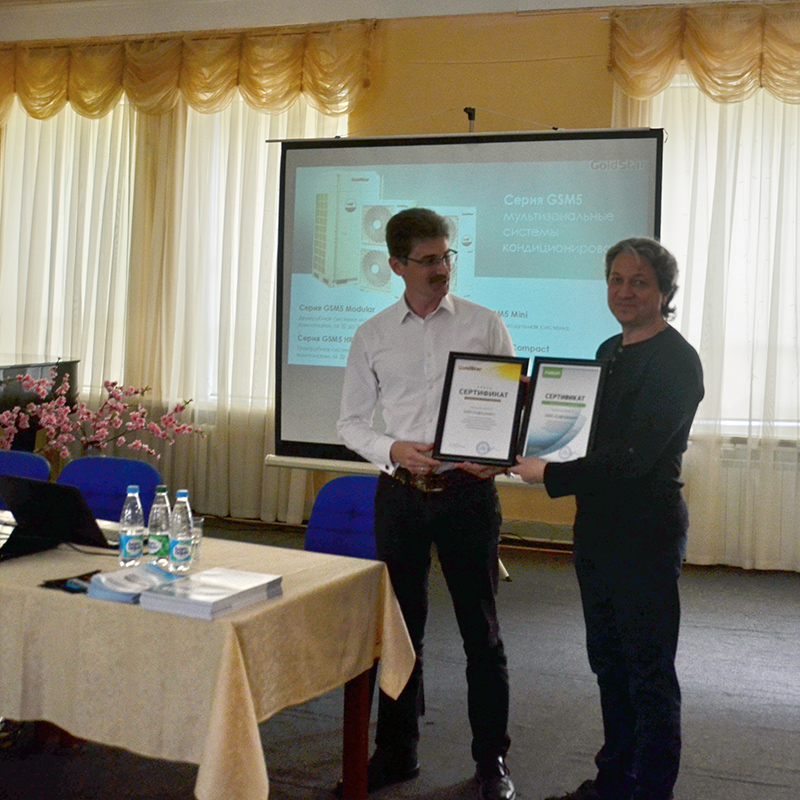 Презентацию кондиционеров GOLDSTAR для собравшихся провел Михаил Бейзман — руководитель отдела «Климатическая техника» представительства GoldStar в России (Москва). Он же вручил сертификаты регионального дистрибьютора и авторизованного сервисного центра GOLDSTAR в Сибирском Федеральном округе Роману Щербаку — коммерческому директору ООО «Софтклимат».