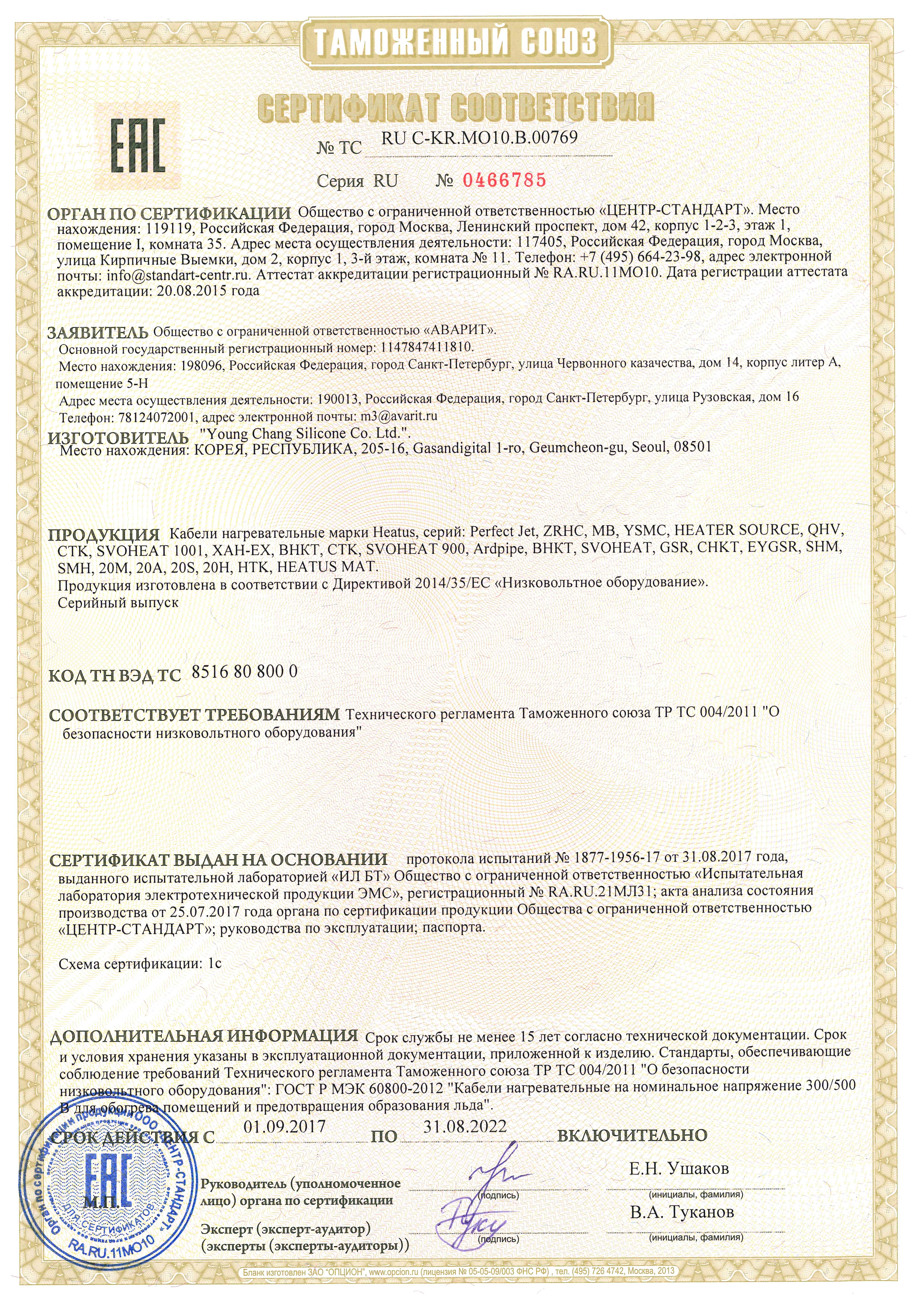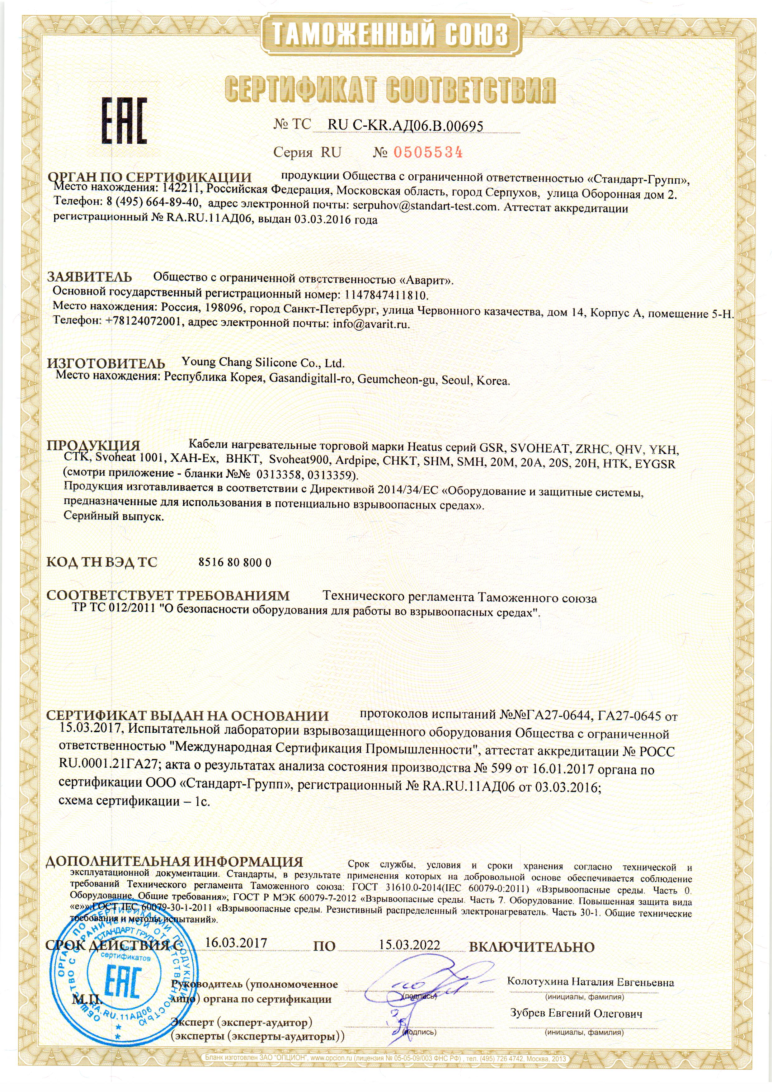Сертификат соответствия на кабели нагревательные Heatus, страница 1