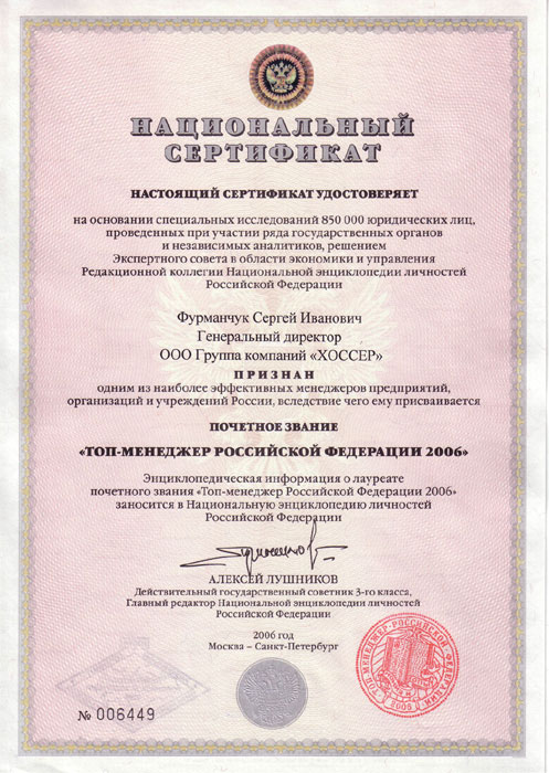 На основании специальных исследований 850 000 юридических лиц, проведенных при участии ряда государственных органов и независимых аналитиков, решением Экспертного совета в области экономики и управления Редакционной коллегии Национальной энциклопедии личностей Российской Федерации, Фурманчук Сергей Иванович, Президент Группы компаний ХОССЕР, признан одним из самых эффективных менеджеров предприятий, организаций и учреждений России, вследствие чего ему присвоено почетное звание !