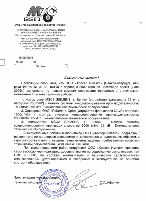 Настоящим сообщаем , что ООО Хоссер Импекс (Санкт-Петербург, наб. реки Фонтанки, д.132 лит.3) в период с 2002 года по настоящее время (июнь 2005 г.) выполнило по нашим заказам следующие проектные/строительно-монтажные/пусконаладочные работы: