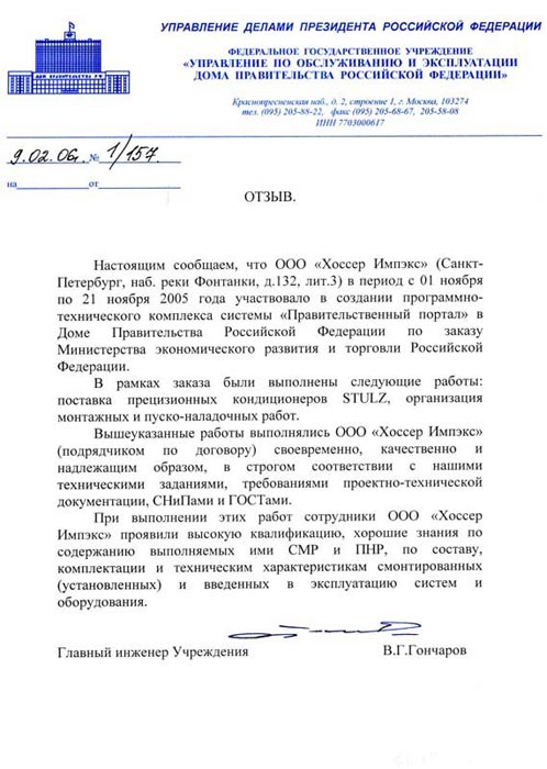 Настоящим сообщаем, что ООО Хоссер Импекс (Санкт-Петербург, наб. реки Фонтанки, д. 132, лит. 3) в период с 01 ноября по 21 ноября 2005 года участвовало в создании программно-технического комплекса Правительственный портал в Доме Правительства Российской Федерации по заказу Министерства экономического развития и торговли Российской Федерации.