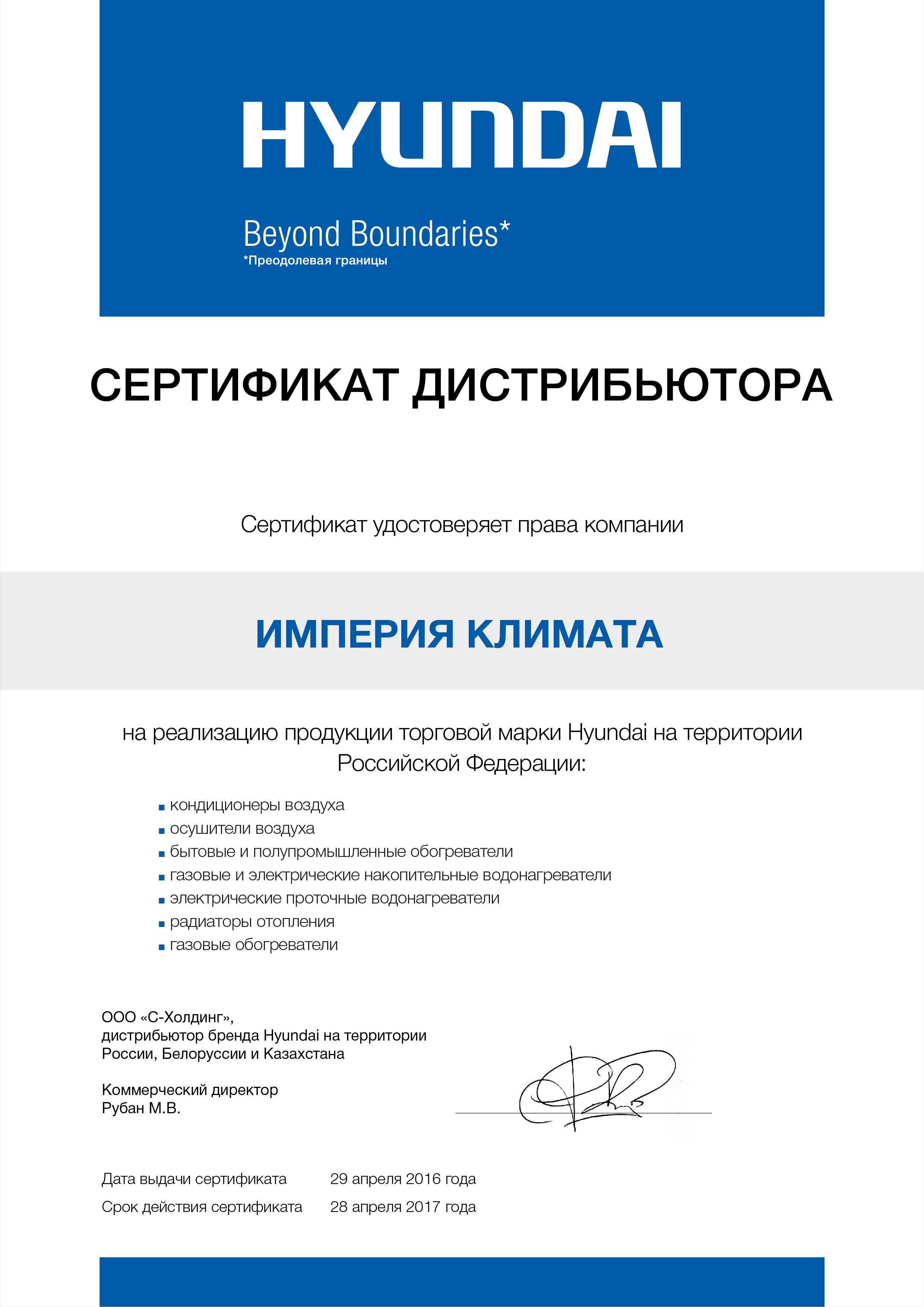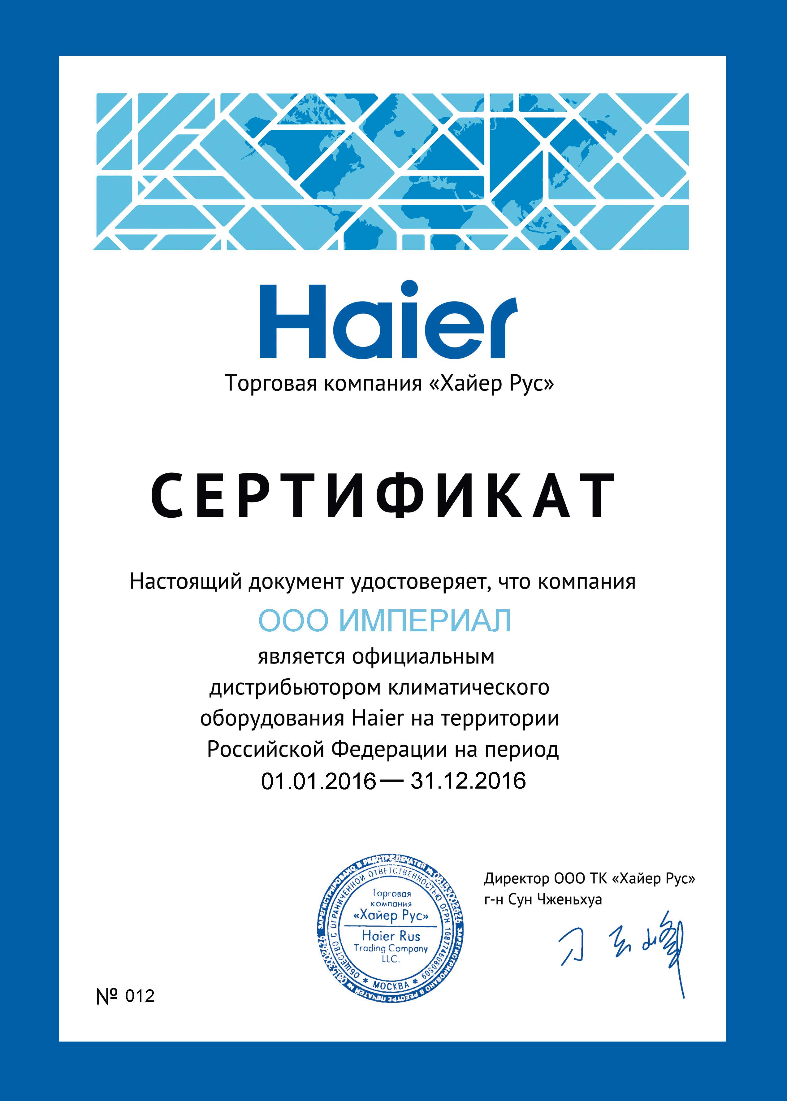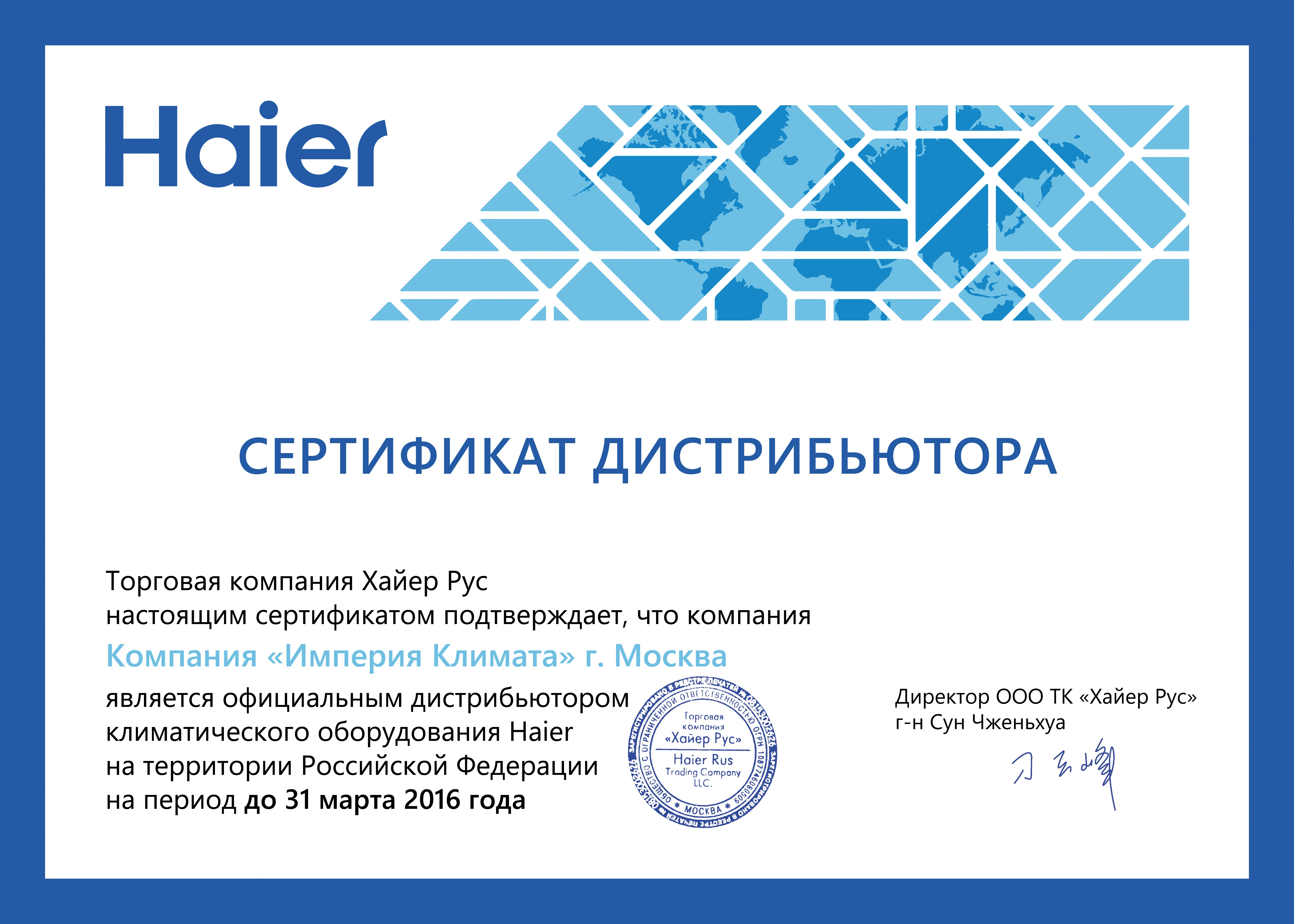 Сертификат официального дистрибьютора Haier (до 31.12.16)