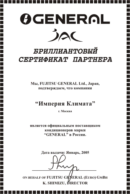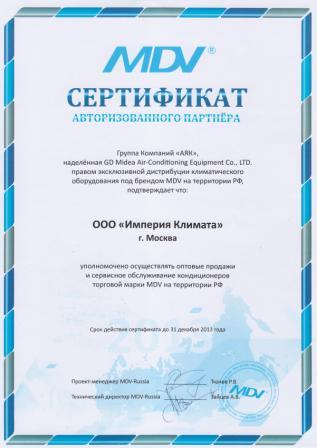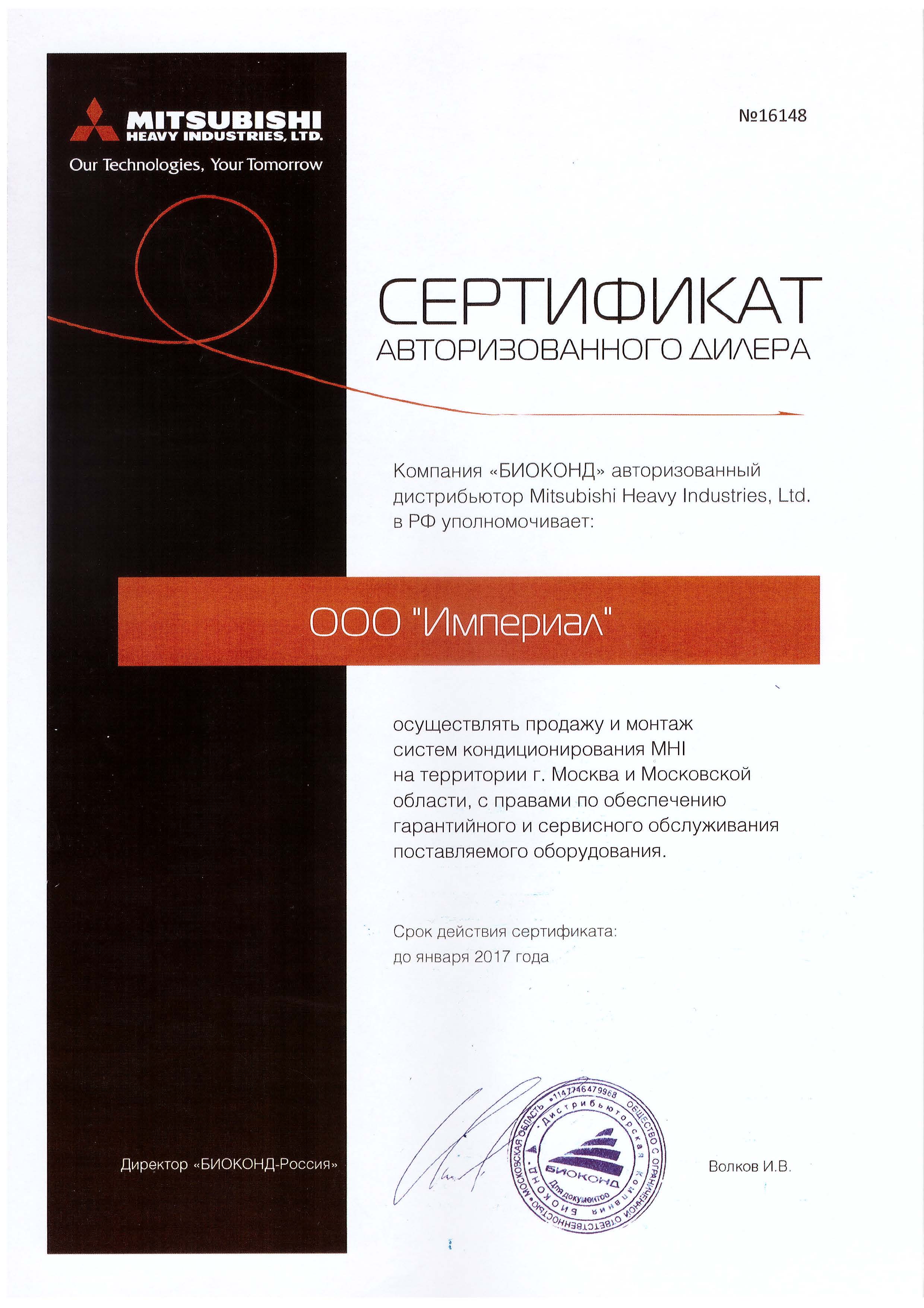 Сертификат авторизованного дистрибьютора Mitsubishi Heavi Industries