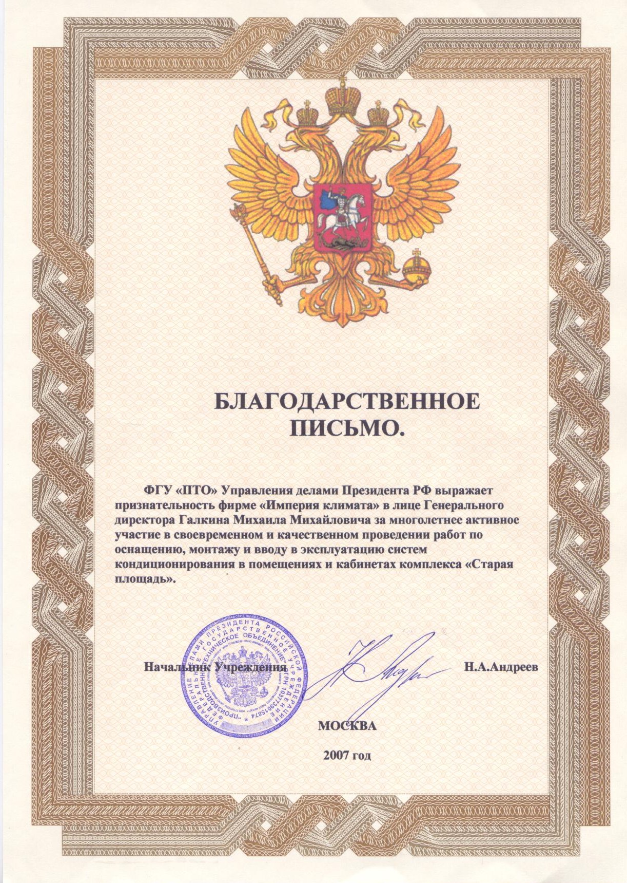 Благодарственное письмо от руководства комплекса «Старая площадь»