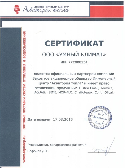 - Сертификат официального дилера Austria Email, Termica, Aquatic, SIME, Mor-FLO, Chaffoteaux, Conti, Olical 2016