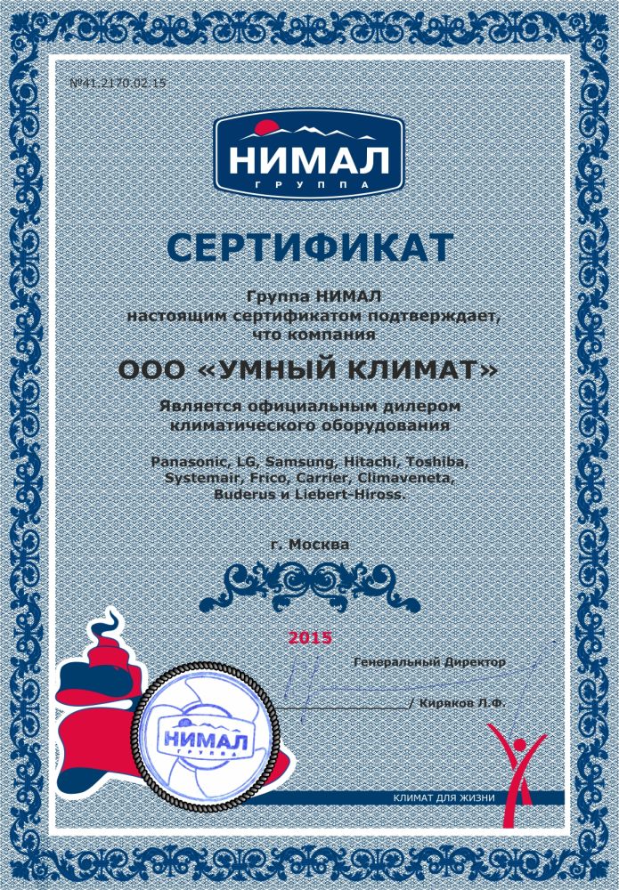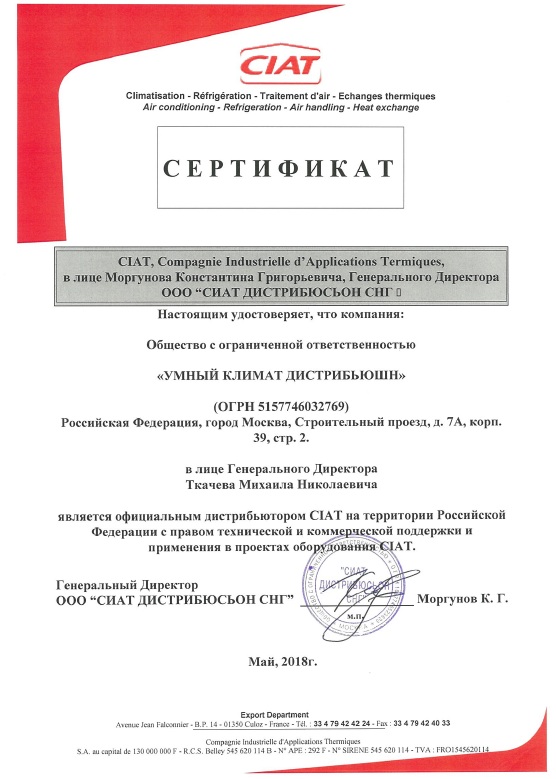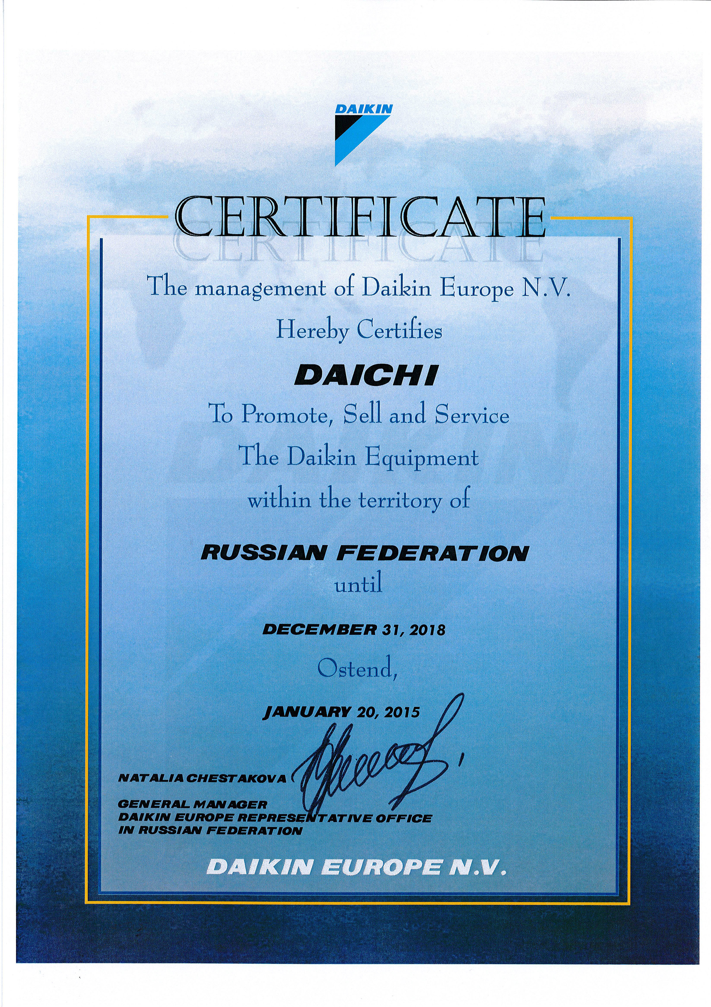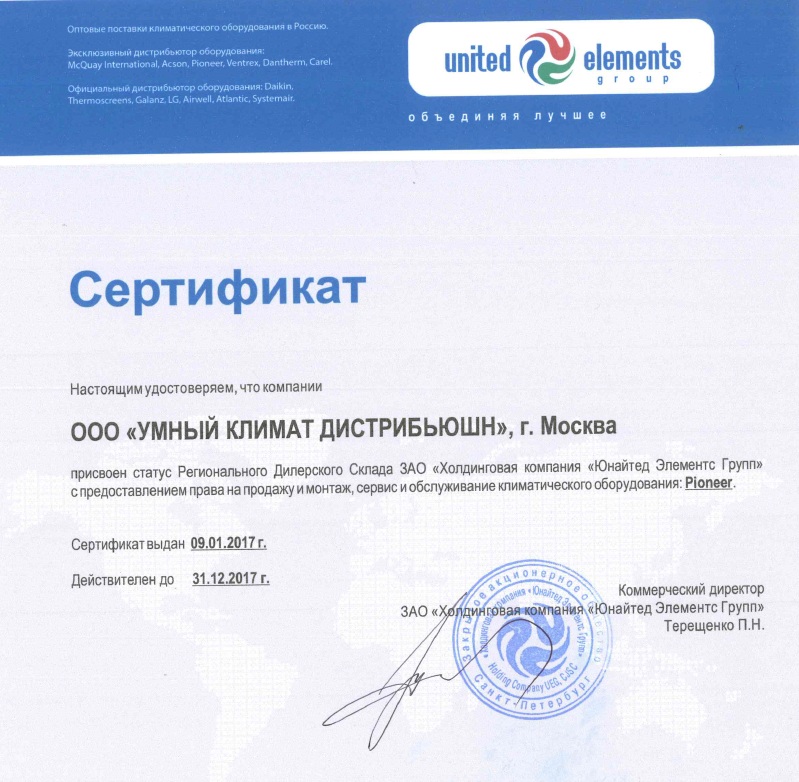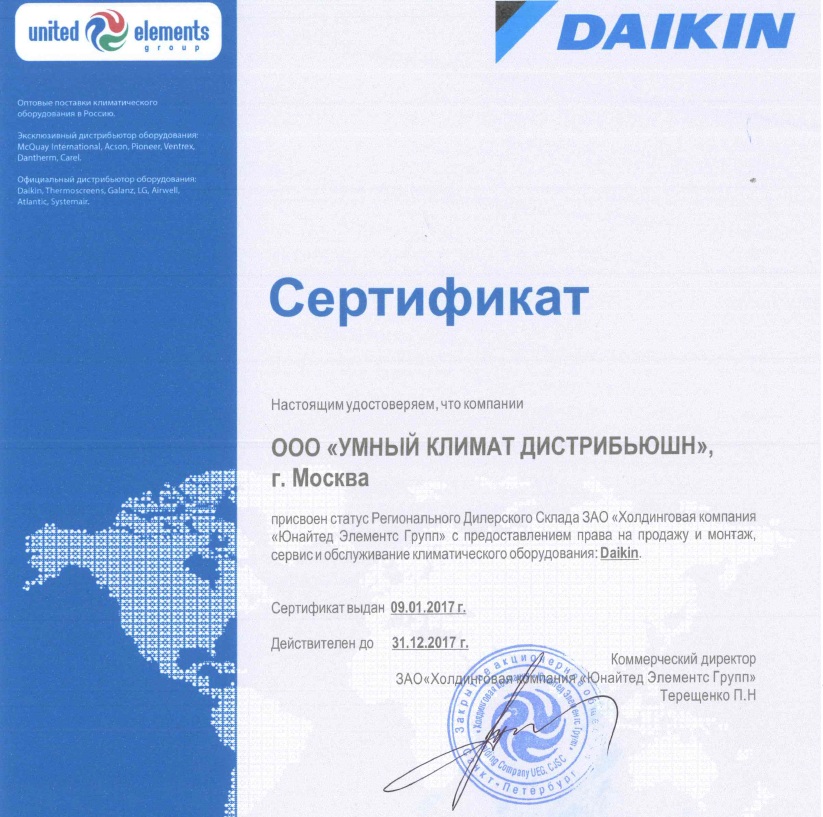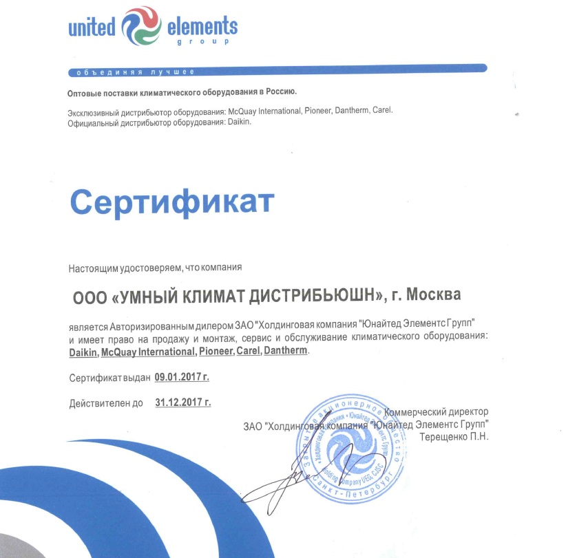 - Сертификат авторизованного дилера ООО «Умный климат дистрибьюшн» Daikin, McQuay International, Pioneer, Carel, Dantherm